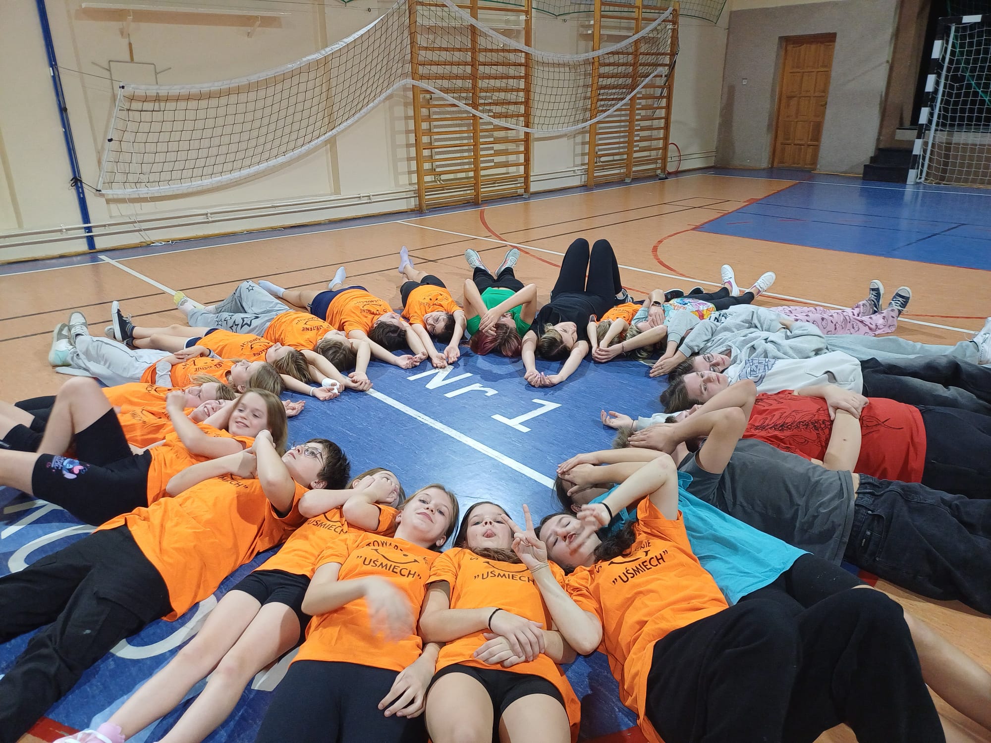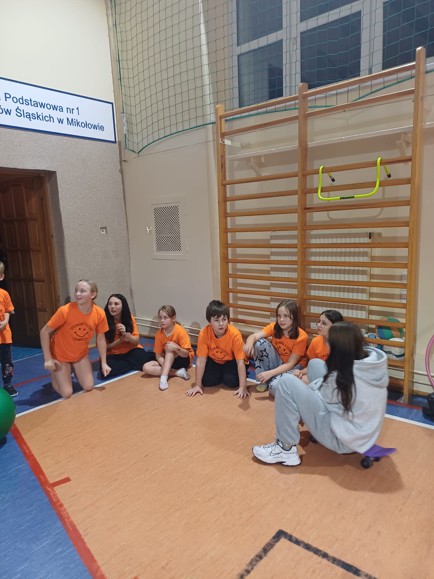 Realizowaliśmy projekt „Uśmiech nas łączy – ruch nudę kończy”. Na sali gimnastycznej SP 1 w Mikołowie kilka razy spotykaliśmy się na zajęciach ruchowych. Wspólnie ćwiczyliśmy, dbaliśmy o sprawność fizyczną, a jednocześnie integrowaliśmy się i dobrze się bawiliśmy. Zajęcia prowadził Pan Poseł, trener – Łukasz Osmalak.